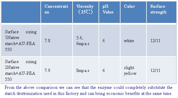AU-PEA starch conversion agent could completely avoid the above shortages. It is a new-type efficient and pollution-free biological product. The AU-PEA product could fully reach the result of ammonium persulfate when used as viscosity breaking agent.XX Paper Factory Test Report of AU-PE550: 1. The native starch cooking process(Application of the product):