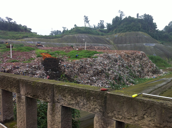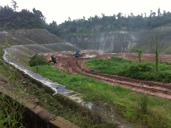 ??1、站在入口拍攝。左側推土機處為今年以來堆放的垃圾。右側為去年堆放的垃圾,已經覆土。??