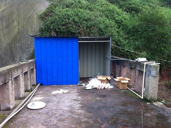 ??3、站在堤壩彩鋼棚拍攝。上面根管為新安裝的PPR管(相對固定,耐用),約150米,終端為塑料軟管(便于隨時拉動,不耐用),根據垃圾堆放距離可隨時增加。??